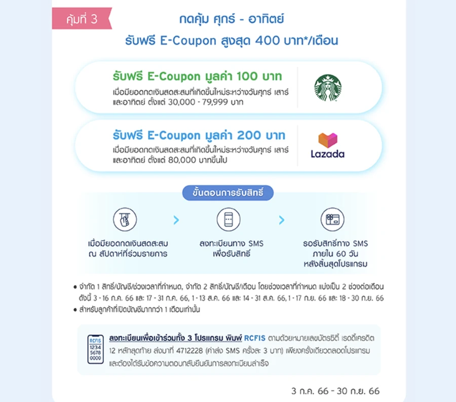 • สมาชิกฯ รับ 1 สิทธิ์ในการแลกรับ E-Coupon Starbucks มูลค่า 100 บาท เมื่อมียอดกดเงินสดสะสมที่เกิดขึ้นใหม่ระหว่างวันศุกร์ เสาร์ และอาทิตย์ ตั้งแต่ 30,000-79,999 บาท