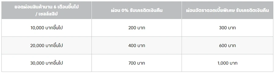 • ยอดเครดิตเงินคืนจะคำนวณจากยอดผ่อนชำระตั้งแต่ 10,000 บาทขึ้นไป/เซลล์สลิป/ชิ้น และผ่อนชำระนาน 6 เดือนขึ้นไป เท่านั้น