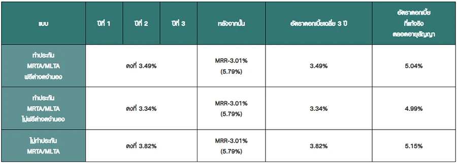 • อัตราดอกเบี้ยทางเลือกแบบทำประกัน MRTA/MLTA ลูกค้าต้องสมัครทำประกัน MRTA/MLTA ผ่านธนาคาร ตามเงื่อนไขที่ธนาคารกำหนด คือ ทุนประกัน 100% ของวงเงินสินเชื่อ ระยะความคุ้มครองขั้นต่ำ 10 ปี
