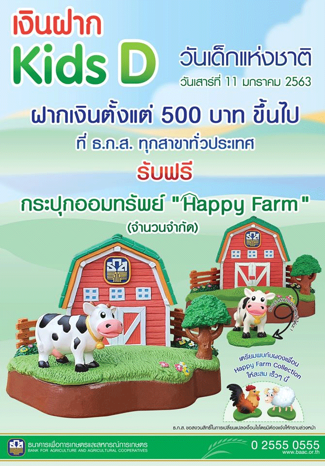 "เงินฝาก Kids D" สำหรับลูกค้า ธ.ก.ส. ที่เปิดบัญชีใหม่ หรือฝากเงินเพิ่มใน บัญชีเงินฝากออมทรัพย์, บัญชีเงินฝากออมทรัพย์ทวีโชค และ บัญชีเงินฝากออมทรัพย์ A-Savings, บัญชีเงินฝากรักษาทรัพย์ ตั้งแต่ 500 บาทขึ้นไป ในวันเด็กแห่งชาติ (วันเสาร์ที่ 11 มกราคม 2563) รับฟรี!! กระปุกออมทรัพย์ "Happy Farm" จาก ธ.ก.ส.