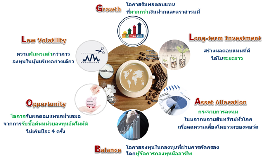 • กระจายการลงทุนในหลากหลายสินทรัพย์ด้วยสัดส่วนที่ช่วยสร้างผลตอบแทนที่ดีในระยะยาว
