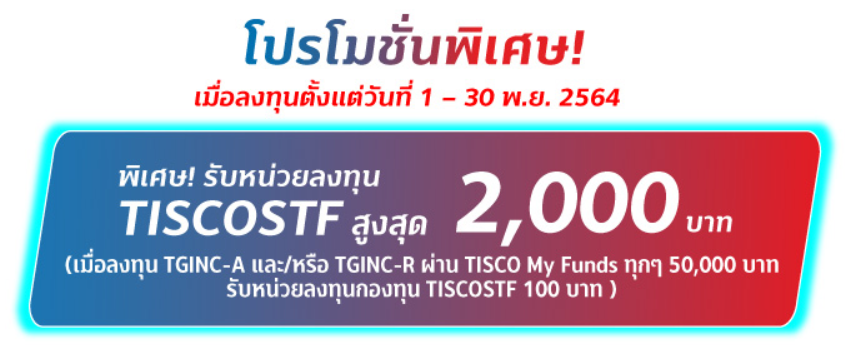 โปรโมชั่นพิเศษ! รับหน่วยลงทุน TISCOSTF สูงสุด 2,000 บาท เมื่อลงทุน TGINC-A และ/หรือ TGINC-R  ผ่าน TISCO My Funds เท่านั้น