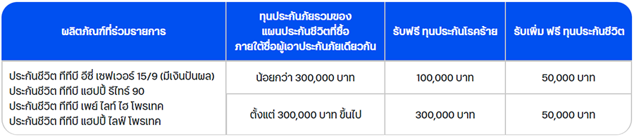 • แผนความคุ้มครองโรคร้ายแรงที่ลูกค้าจะได้รับจะคำนวณจากทุนประกันชีวิตรวมทั้งหมดของทุกผลิตภัณฑ์ที่ร่วมรายการที่ลูกค้าซื้อ