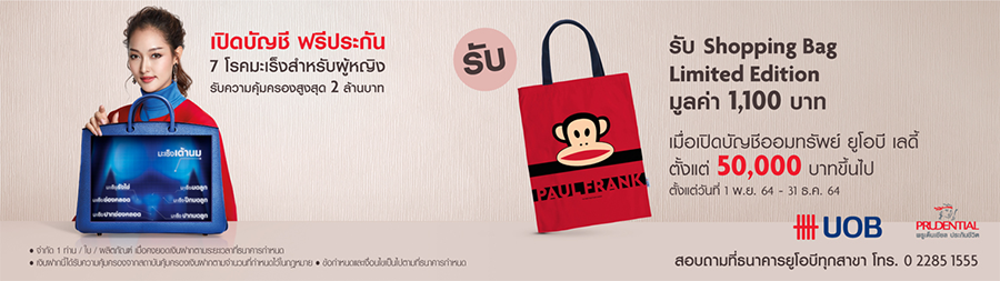 เปิดบัญชีออมทรัพย์ยูโอบี เลดี้ ตั้งแต่ 50,000 บาท แต่ไม่ถึง 5 แสนบาท พร้อมคงเงินตามเงื่อนไข  ณ สาขาของธนาคารยูโอบี สำหรับลูกค้าใหม่ที่เปิดบัญชีออมทรัพย์ ยูโอบี เลดี้ ตั้งแต่ 1 พ.ย. 64 – 31 ธ.ค. 64 และมียอดเงินฝาก 50,000 บาทเป็นต้นไป ณ วันเปิดบัญชี ติดต่อกันตามระยะเวลาที่กำหนด จะได้รับ Paul Frank Shopping Bag จำนวน 1 ใบ มูลค่า 1,100 บาท ซึ่งมูลค่าของกำนัลเทียบเท่าดอกเบี้ยเงินฝากที่เพิ่มขึ้นร้อยละ 2.20 ต่อปี คำนวณจากมูลค่าของกำนัล 1,100 บาท สำหรับยอดเงินฝาก 50,000 บาทตลอดระยะเวลา 1 ปี