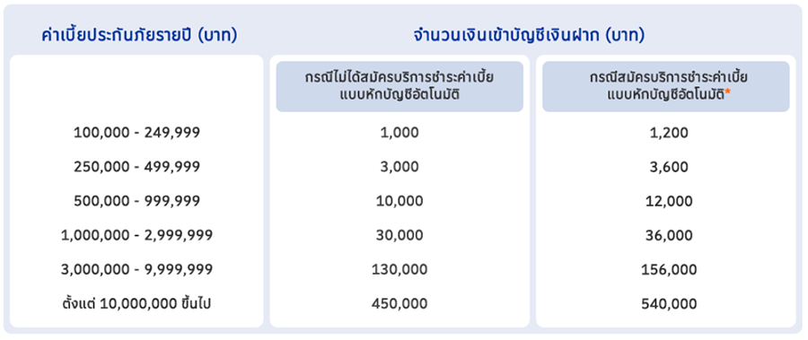 • ผู้เอาประกันภัยจะได้รับเงินคืนเข้าบัญชีเงินฝากเฉพาะการชำระค่าเบี้ยประกันภัยปีแรก โดยคำนวณจากเบี้ยประกันภัยมาตรฐานปีแรกเท่านั้น ทั้งนี้ ผู้เอาประกันภัยมีสิทธิได้รับเงินคืนจากกรมธรรม์ทุกฉบับที่เป็นไปตามเงื่อนไข ในกรณีที่ ผู้เอาประกันภัยมีกรมธรรม์หลายฉบับ สามารถนำค่าเบี้ยประกันภัยมารวมกันได้ เฉพาะกรมธรรม์ที่ซื้อภายในเดือนเดียวกันเท่านั้น
