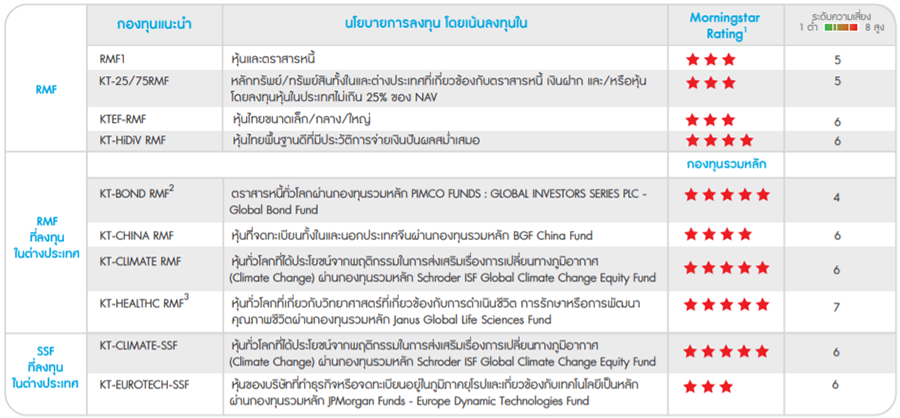 • กองทุนเปิดกรุงไทยตราสารหนี้เพื่อการเลี้ยงชีพ (RMF2), กองทุนเปิดกรุงไทยตราสารหนี้ภาครัฐเพื่อการเลี้ยงชีพ (RMF3), กองทุนเปิดกรุงไทยตลาดเงินเพื่อการเลี้ยงชีพ (RMF4), กองทุนเพื่อการออม ชนิดเพื่อการออมพิเศษ (SSFX) และกองทุนใหม่ RMF/SSF (ปกติ) ในปี 2565 ที่บริษัทอาจประกาศยกเว้นภายหลัง ไม่เข้าร่วมรายการส่งเสริมการขายนี้