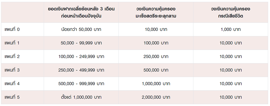 ข้อกำหนด และเงื่อนไขความคุ้มครอง : รับความคุ้มครองมะเร็งระยะลุกลามในสตรี สูงสุด 2 ล้านบาท และความคุ้มครองชีวิตสูงสุด 10,000 บาท ต่อคน โดยคำนวณจากยอดเงินฝากเฉลี่ยย้อนหลัง 3 เดือนก่อนหน้าเดือนปัจจุบัน ตามรายละเอียดดังนี้