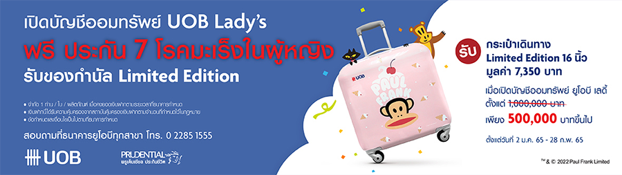 เปิดบัญชี UOB Lady’s savings ตั้งแต่ 500,000 บาท พร้อมคงเงินตามเงื่อนไข ณ สาขาธนาคารยูโอบี สำหรับลูกค้าใหม่ที่เปิดบัญชีออมทรัพย์ ยูโอบี เลดี้ ตั้งแต่ 2 ม.ค. 65 – 28 ก.พ. 65 และมียอดเงินฝาก 500,000 บาทขึ้นไป ณ วันเปิดบัญชี ติดต่อกันตามระยะเวลาที่กำหนด จะได้รับ Paul Frank Trolley Bag 16 นิ้ว จำนวน 1 ชิ้น มูลค่า 7,350 บาท ซึ่งมูลค่าของกำนัลเทียบเท่าดอกเบี้ยเงินฝากที่เพิ่มขึ้นร้อยละ 1.47 ต่อปี คำนวณจากมูลค่าของกำนัล 7,350 บาท สำหรับยอดเงินฝาก 500,000 บาทตลอดระยะเวลา 1 ปี