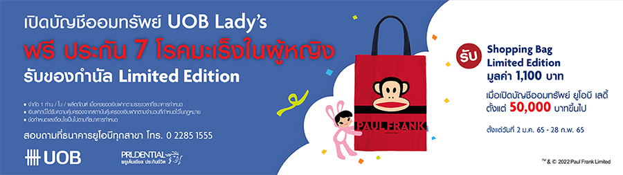 เปิดบัญชีออมทรัพย์ยูโอบี เลดี้ ตั้งแต่ 50,000 บาท แต่ไม่ถึง 5 แสนบาท พร้อมคงเงินตามเงื่อนไข  ณ สาขาของธนาคารยูโอบี สำหรับลูกค้าใหม่ที่เปิดบัญชีออมทรัพย์ ยูโอบี เลดี้ ตั้งแต่ 2 ม.ค. 65 – 28 ก.พ. 65 และมียอดเงินฝาก 50,000 บาทขึ้นไป ณ วันเปิดบัญชี ติดต่อกันตามระยะเวลาที่กำหนด จะได้รับ Paul Frank Shopping Bag จำนวน 1 ชิ้น มูลค่า 1,100 บาท ซึ่งมูลค่าของกำนัลเทียบเท่าดอกเบี้ยเงินฝากที่เพิ่มขึ้นร้อยละ 2.20 ต่อปี คำนวณจากมูลค่าของกำนัล 1,100 บาท สำหรับยอดเงินฝาก 50,000 บาทตลอดระยะเวลา 1 ปี