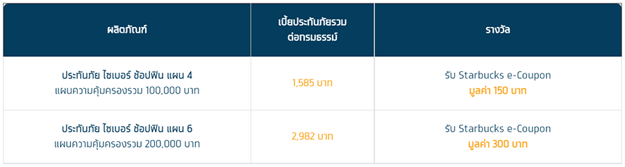 ช้อปออนไลน์อย่างมั่นใจ ปลอดภัยด้วยประกันภัย ไซเบอร์ ช้อปฟิน คุ้มครองสูงสุด 200,000 บาท พิเศษ! รับฟรี Starbucks e-Coupon สูงสุด 300 บาท เมื่อซื้อประกันภัย ไซเบอร์ ช้อปฟิน ของ บมจ.กรุงไทยพานิชประกันภัยตามเงื่อนไขที่กำหนดผ่าน Krungthai NEXT