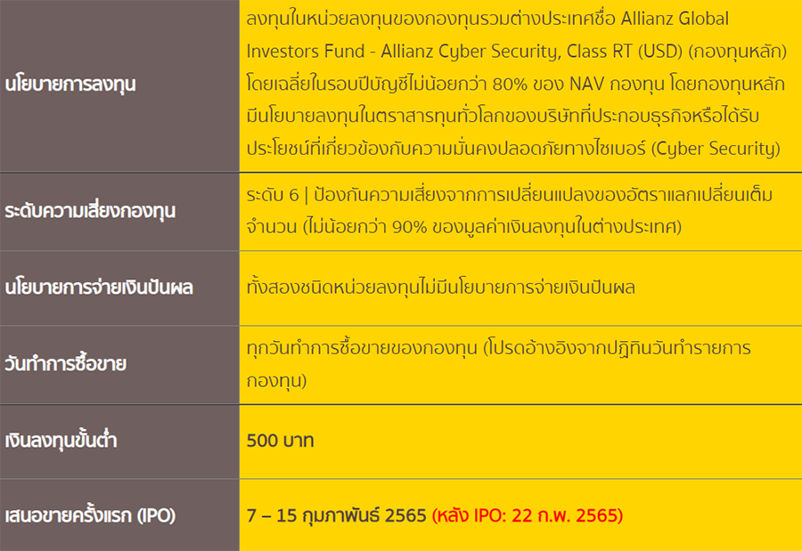 กองทุนเปิดกรุงศรีไซเบอร์ซีเคียวริตี้ - สะสมมูลค่า (KFCYBER-A) ลงทุนผ่านกองทุนหลัก Allianz Global Investors Fund - Allianz Cyber Security