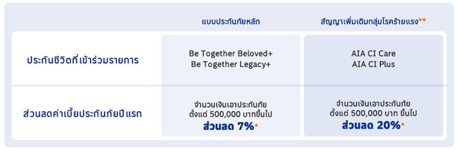 พร้อมรับส่วนลดค่าเบี้ยสูงสุด 20% ของค่าเบี้ยประกันภัยปีแรก เมื่อสมัครประกันชีวิต บี ทูเกตเทอร์ ที่ร่วมรายการ ตั้งแต่วันที่ 1 มี.ค. 65 - 31 มี.ค. 65 (กรมธรรม์อนุมัติภายในวันที่ 31 มี.ค. 65)