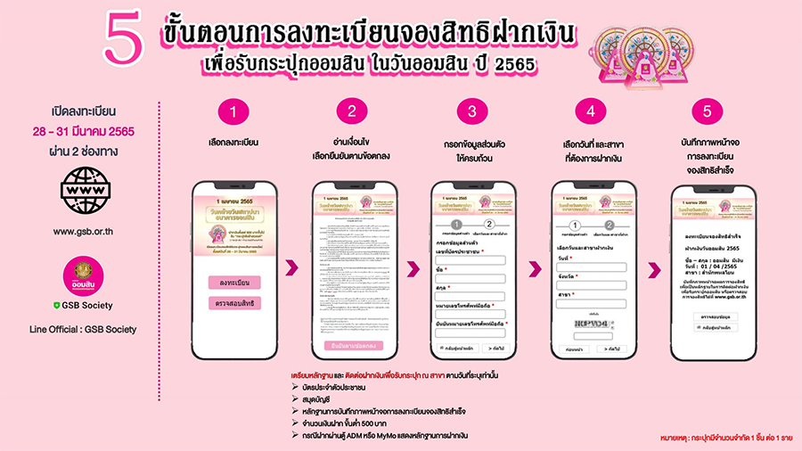 เปิดลงทะเบียนจองสิทธิรับกระปุกออมสินทางออนไลน์ : ตั้งแต่วันที่ 28 - 31 มีนาคม 2565