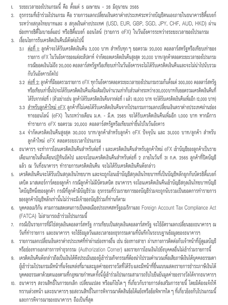 เงื่อนไข และข้อกำหนดโปรแกรมเครดิตเงินคืนจากการแลกเปลี่ยนเงินตราต่างประเทศ ผ่านช่องทางออนไลน์ (eFX) ทุกวันอังคาร