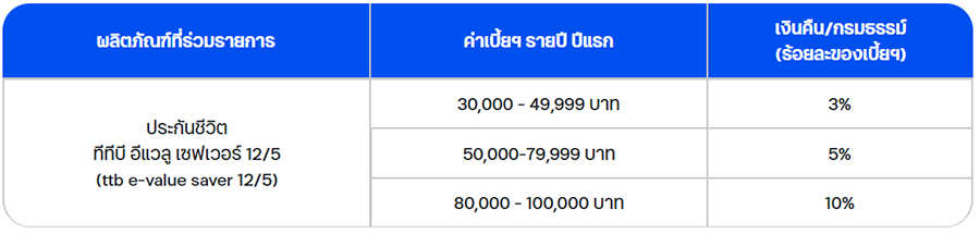 1. สำหรับลูกค้าที่ซื้อผลิตภัณฑ์ประกันชีวิต ทีทีบี อีแวลู เซฟเวอร์ 12/5 จะได้รับเงินคืนสูงสุด 10,000 บาท โดยชำระค่าเบี้ยประกันชีวิตแบบรายปีเฉพาะปีแรก และรับเพิ่ม Grab e-voucher มูลค่า 300 บาทเมื่อเลือกช่องทางการรับเล่มกรมธรรม์แบบ e-policy ในระหว่างวันที่ 1 มิ.ย. 65 – 30 มิ.ย. 65 เท่านั้น โดยบริษัทฯจะจัดส่ง Grab e-voucher ผ่าน SMS ตามหมายเลขโทรศัพท์มือถือที่ลูกค้าได้ให้ไว้ในวันที่สมัครประกันฯ ภายใน 45 วันนับจากวันที่ซื้อกรมธรรม์ โดยกรมธรรม์ของลูกค้ายังต้องมีผลบังคับใช้ในรูปแบบ e-policy และพ้นระยะเวลาใช้สิทธิ์ (Free-look period) และมีผลบังคับจนถึงวันที่รับเงินคืนเข้าบัญชีเงินฝาก ttb รายละเอียดเงื่อนไขเป็นไปตามที่ธนาคารกำหนด
