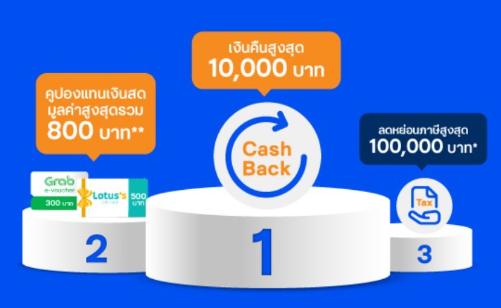 • ต่อที่ 1 จะได้รับเงินคืนเข้าบัญชีเงินฝากสูงสุด 10,000 บาท ต่อกรมธรรม์ เมื่อชำระค่าเบี้ยประกันชีวิตแบบรายปี เฉพาะปีแรกตั้งแต่ 30,000 บาท ขึ้นไป และกรมธรรม์ต้องได้รับการอนุมัติโดยมีผลบังคับจนถึงวันที่คืนเงินเข้าบัญชี