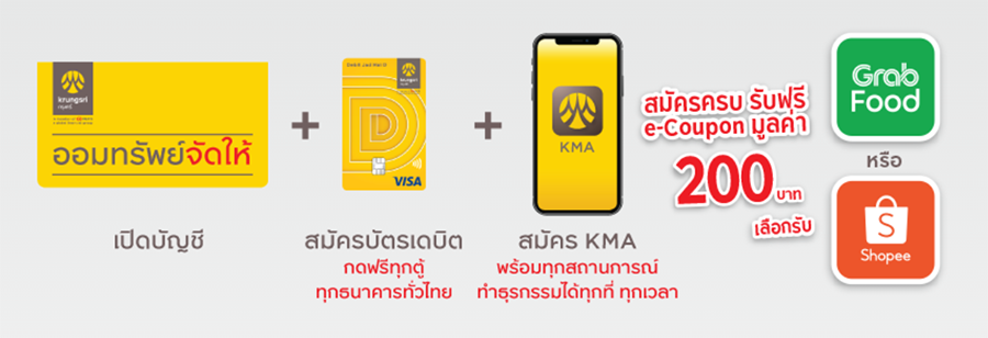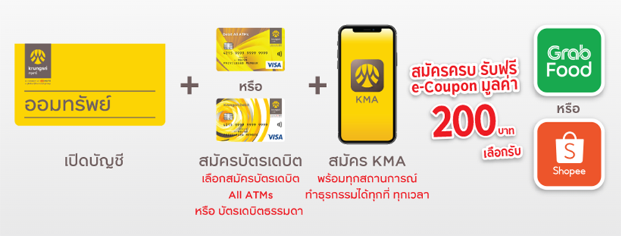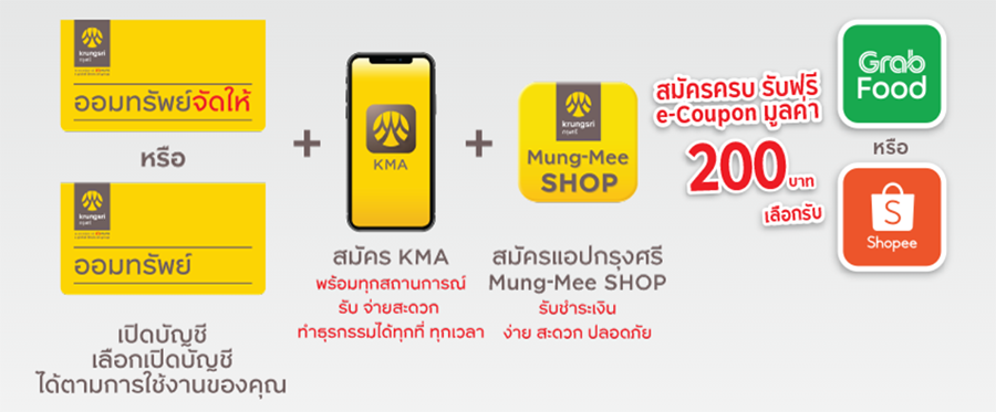 สำหรับลูกค้าทั่วไป : เลือก โซลูชั่นชุดสะดวกคล่องตัวเพื่อทำธุรกรรม เพื่อเพิ่มความสะดวกในการใช้จ่ายประจำวัน สมัครครบ รับฟรี e-Coupon มูลค่า 200 บาท เลือกรับ GrabFood e-Coupon หรือ Shopee e-Coupon