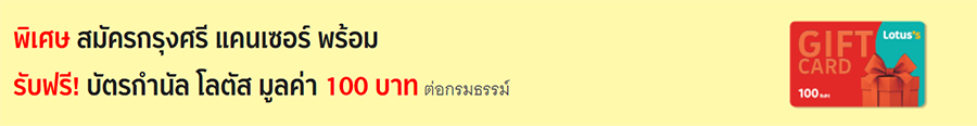 สมัครประกันภัยสำเร็จรูป กรุงศรี แคนเซอร์ พร้อม รับฟรี! บัตรกำนัล โลตัส มูลค่า 100 บาท ต่อกรมธรรม์