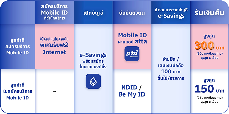 บัญชี e-Savings พร้อมสมัครโมบายแบงก์กิ้ง จากธนาคารกรุงเทพ และยืนยันตัวตนด้วย Mobile ID ผ่านแอป atta พร้อมเติมเงินหรือจ่ายบิลค่าโทรศัพท์มือถือขั้นต่ำ 100 บาท