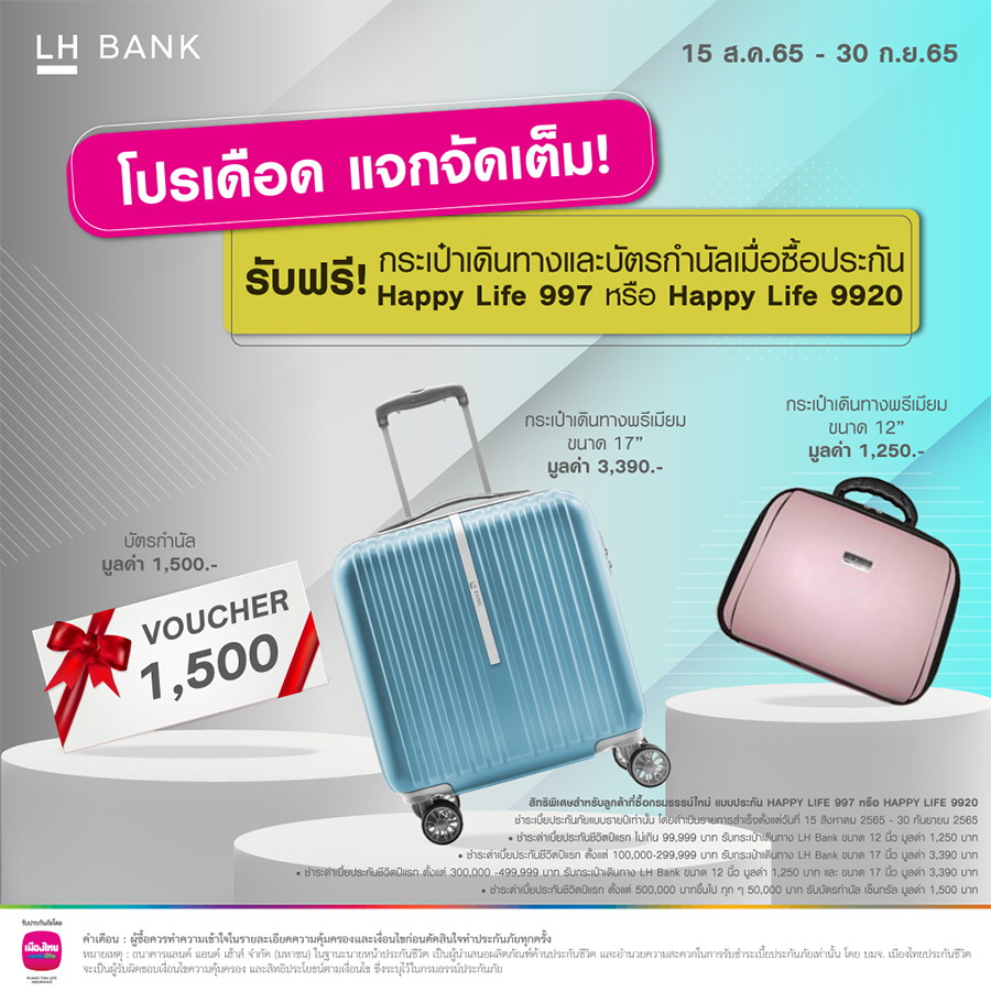 โปรเดือด แจกจัดเต็ม! รับฟรี กระเป๋าเดินทาง และบัตรกำนัลเมื่อซื้อประกัน HAPPY LIFE 997 หรือ HAPPY LIFE 9920 และชำระเบี้ยประกันแบบรายปี
