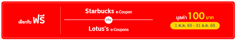 2. จำกัดการเลือกรับของกำนัล 20,000 สิทธิ์ ได้แก่ Lotus’s e-Coupons จำกัดจำนวน 10,000 สิทธิ์ หรือ Starbucks e-Coupon จำกัดจำนวน 10,000 สิทธิ์ และจำกัดคนละ 1 สิทธิ์ ตลอดระยะเวลารายการส่งเสริมการขาย
