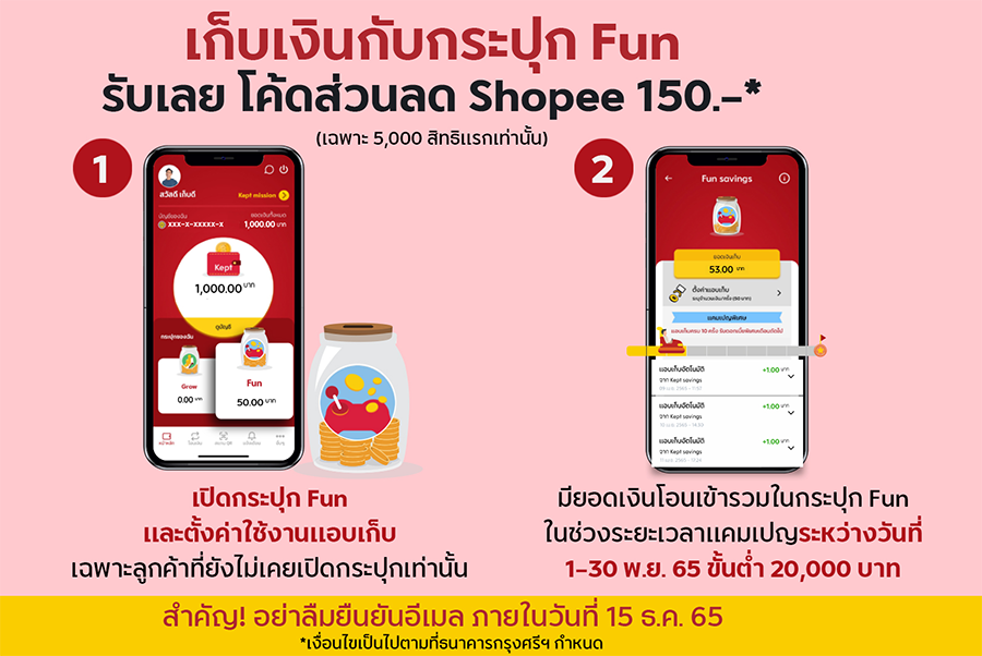 Kept ชวนเก็บเงินเข้ากระปุก Fun รับฟรี ! โค้ดส่วนลด Shopee 150 บาท เพียงมียอดโอนเข้ารวมขั้นต่ำ 20,000 บาท* (เฉพาะ 5,000 สิทธิ์แรกเท่านั้น)