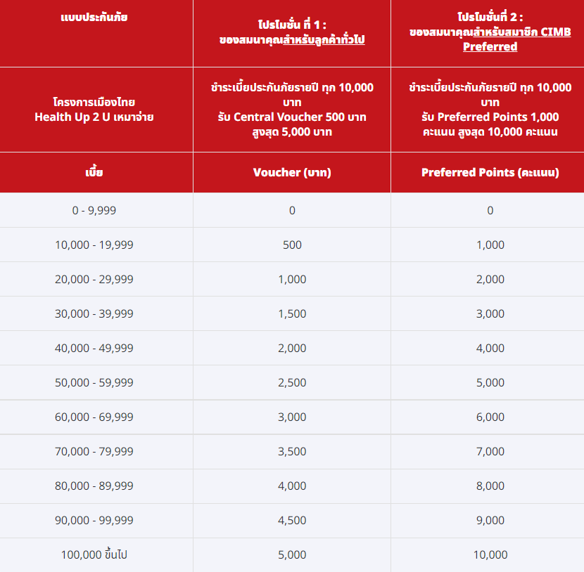 - สำหรับสมาชิก CIMB Preferred ที่ซื้อผลิตภัณฑ์ประกันชีวิตใน โครงการเมืองไทย Health Up 2 U เหมาจ่าย ผ่านช่องทาง Online CIMB THAI Digital Banking และชำระค่าเบี้ยประกันชีวิตแบบรายปี เฉพาะการชำระเบี้ยประกันภัยต่อกรมธรรม์ในปีแรกเท่านั้น ตั้งแต่ 8 พ.ย. 65 – 30 ธ.ค. 65 เท่านั้น