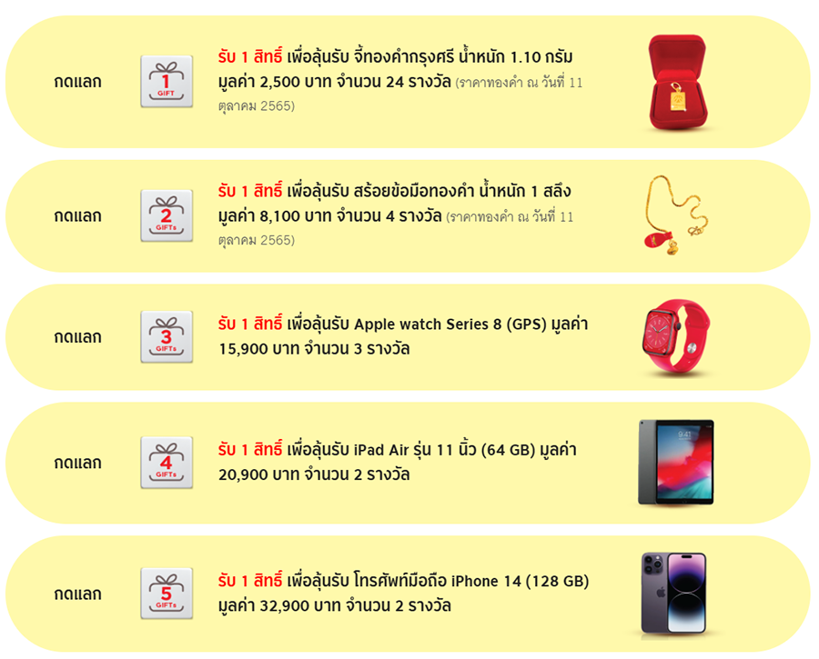 - กดแลก 5 กิฟท์ รับ 1 สิทธิ์ เพื่อลุ้นรับรางวัลประเภทโทรศัพท์มือถือ iPhone 14 (128 GB) มูลค่า 32,900 บาท