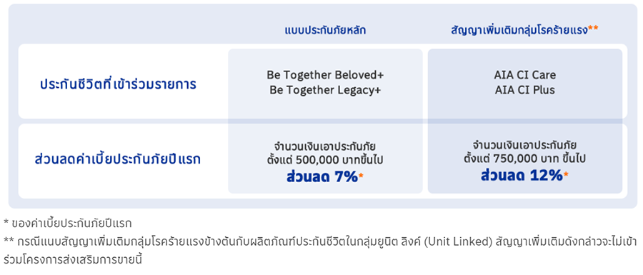 ต่อที่ 1 รับส่วนลดค่าเบี้ยปีแรกสูงสุด 12%* ของค่าเบี้ยประกันภัยปีแรก เมื่อสมัครประกันชีวิต Be Together ที่ร่วมรายการ