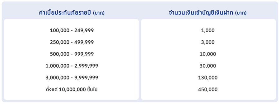 4. ผู้เอาประกันภัยจะได้รับเงินคืนเข้าบัญชีเงินฝากเฉพาะการชำระค่าเบี้ยประกันภัยปีแรก โดยคำนวณจากเบี้ยประกันภัยมาตรฐานปีแรกเท่านั้น ทั้งนี้ ผู้เอาประกันภัยมีสิทธิได้รับเงินคืนจากกรมธรรม์ทุกฉบับที่เป็นไปตามเงื่อนไข ในกรณีที่ผู้เอาประกันภัยมีกรมธรรม์หลายฉบับ สามารถนำค่าเบี้ยประกันภัยมารวมกันได้ เฉพาะกรมธรรม์ที่ซื้อภายในเดือนเดียวกันเท่านั้น
