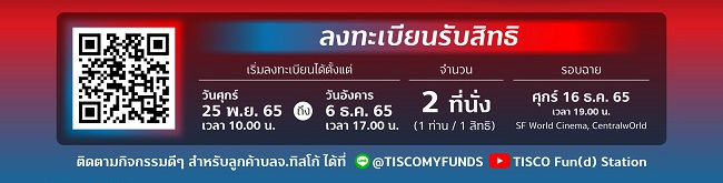 1. สงวนสิทธิ์สำหรับลูกค้าที่ลงทุนในกองทุน SSF/RMF/LTF/RMF for PVD กับบลจ.ทิสโก้ โดยมีมูลค่าหน่วยลงทุนตั้งแต่ 100,000 บาทขึ้นไป ณ วันที่ 31 ตุลาคม 2565 และยังมีการถือครองหน่วยลงทุนอยู่ ณ วันที่จัดกิจกรรมเท่านั้น โดยลูกค้า 430 ท่านแรกที่ลงทะเบียนจะได้รับตั๋วหนังเรื่อง Avatar: The Way of Water ในวันศุกร์ที่ 16 ธ.ค. 65 รอบเวลา 19.00 น. ณ โรงภาพยนตร์ SF ศูนย์การค้า Central World จำนวน 2 ที่นั่ง (1 ท่าน/1 สิทธิ)