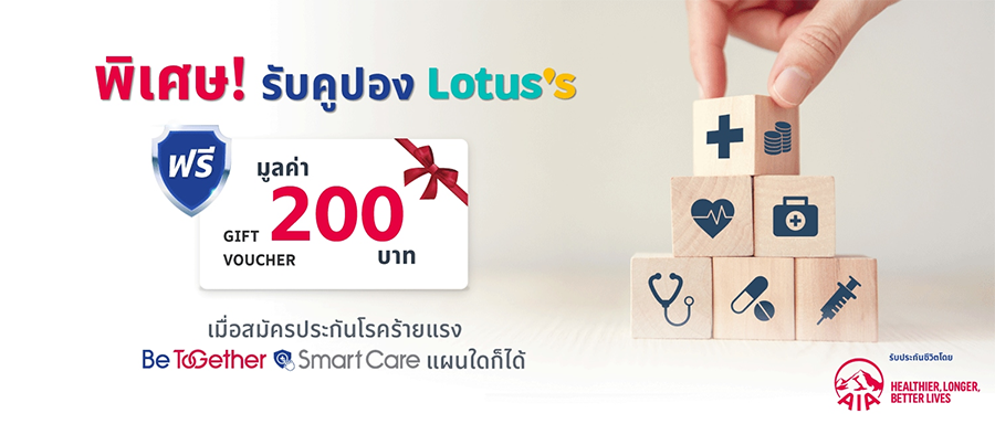 สิทธิพิเศษสำหรับลูกค้าที่สมัคร และชำระค่าเบี้ยประกัน ประกันโรคร้ายแรง Be Together Smart Care รับบัตรของขวัญ Lotus มูลค่า 200 บาท*