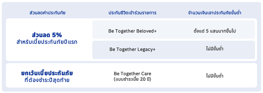 3. สิทธิพิเศษสำหรับบัตรเครดิตธนาคารกรุงเทพ เมื่อสมัครและชำระค่าเบี้ยกรมธรรม์ใหม่ ผลิตภัณฑ์ Be Together ที่ร่วมรายการของบริษัทฯ และขายผ่านช่องทางสาขาธนาคารกรุงเทพเท่านั้น โดยต้องสมัครระหว่างวันที่ 1 มกราคม 2566 ถึง 31 มีนาคม 2566 เฉพาะค่าเบี้ยประกันชีวิตแบบรายปี ปีแรกเท่านั้น