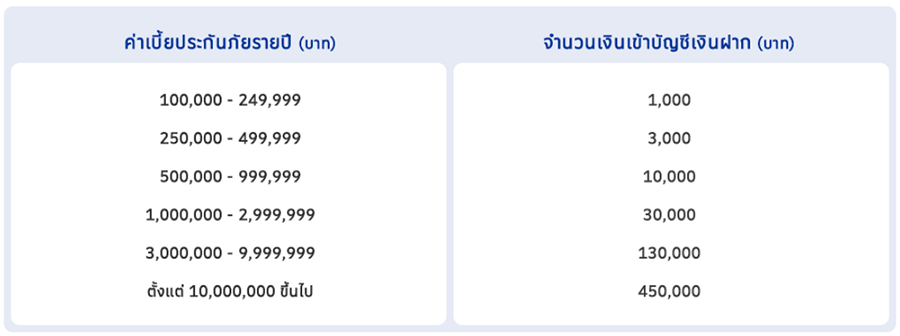 4. ผู้เอาประกันภัยจะได้รับเงินคืนเข้าบัญชีเงินฝากเฉพาะการชำระค่าเบี้ยประกันภัยปีแรก โดยคำนวณจากเบี้ยประกันภัยมาตรฐานปีแรกเท่านั้น ทั้งนี้ ผู้เอาประกันภัยมีสิทธิได้รับเงินคืนจากกรมธรรม์ทุกฉบับที่เป็นไปตามเงื่อนไข ในกรณีที่ผู้เอาประกันภัยมีกรมธรรม์หลายฉบับ สามารถนำค่าเบี้ยประกันภัยมารวมกันได้ เฉพาะกรมธรรม์ที่ซื้อภายในเดือนเดียวกันเท่านั้น