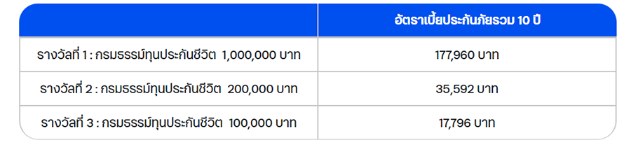 12. ผู้มีสิทธิได้รับรางวัลที่เลือกรับรางวัลกรมธรรม์ประกันชีวิต ต้องมีอายุระหว่าง 20 - 55 ปี โดยต้องแสดงเอกสารบัตรประจำตัวประชาชนเพื่อยืนยันตัวตน แจ้งรายละเอียดชื่อ-นามสกุล / เพศ /วันเดือนปีเกิด /อายุ และแจ้งชื่อ-นามสกุลของผู้รับผลประโยชน์ รวมถึงตอบคำถามสุขภาพ ทั้งนี้ มูลค่าของรางวัลประกันชีวิตขึ้นอยู่กับเบี้ยประกันภัยตามอายุของผู้มีสิทธิ์ที่จะได้รับรางวัล (ผู้เอาประกันภัย) ตามเงื่อนไขที่ระบุไว้ในกรมธรรม์