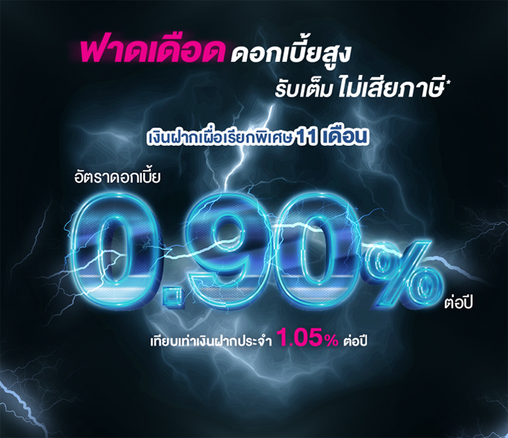 รายละเอียดอัตราดอกเบี้ย : ระยะเวลาฝาก 11 เดือน รับอัตราดอกเบี้ย 0.90% ต่อปี