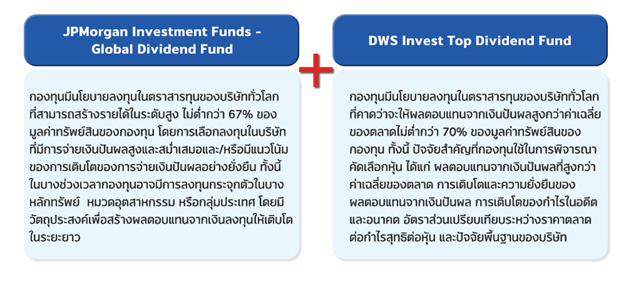 นโยบายการลงทุน : กองทุนจะลงทุนในหน่วยลงทุนของกองทุนรวมตราสารทุนต่างประเทศ และ/หรือกองทุนรวมอีทีเอฟตราสารทุนต่างประเทศในภูมิภาคต่างๆ ทั่วโลก ซึ่งมีนโยบายการลงทุนในตราสารทุนของบริษัทที่มีการจ่ายเงินปันผลสูงและสม่ำเสมอ หรือบริษัทที่มีแนวโน้มการจ่ายเงินปันผลที่ดีหรือมีการเติบโตของเงินปันผลอย่างยั่งยืน โดยเฉลี่ยในรอบปีบัญชีไม่น้อยกว่า 80% ของมูลค่าทรัพย์สินสุทธิของกองทุน​