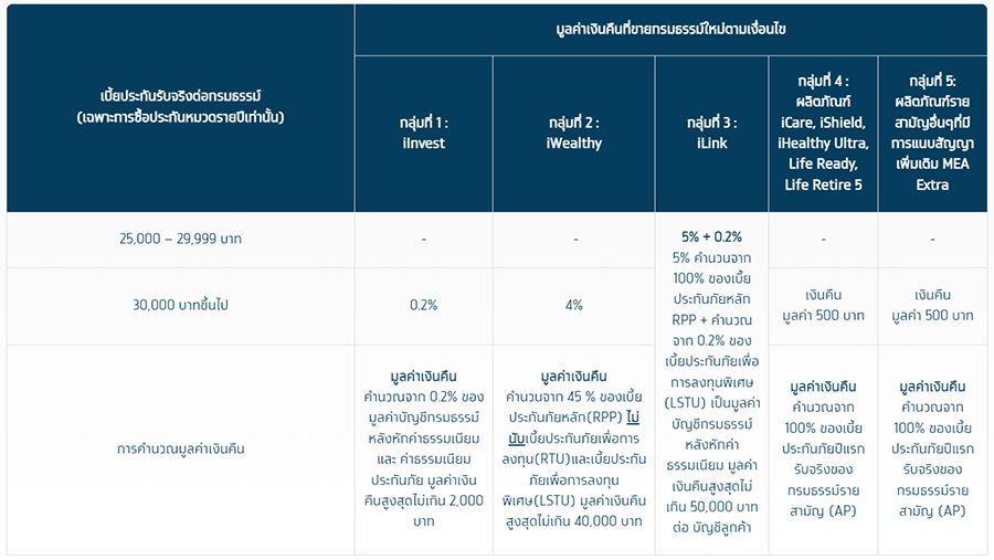 6. สงวนสิทธิ์เฉพาะกรมธรรม์ประกันชีวิตที่มีเบี้ยประกันภัยรับจริง (FYP) ตามที่ระบุไว้ในตารางข้างต้นเท่านั้น โดยจะได้รับเงินคืนตามมูลค่าที่กำหนดต่อ 1 กรมธรรม์ที่มีมูลค่าเงินคืนมากที่สุดต่อ 1 บัญชีลูกค้าที่เข้าเงื่อนไข