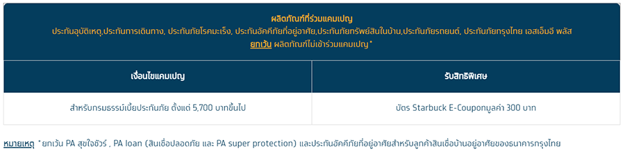 3. ผลิตภัณฑ์ประกันวินาศภัย ที่ ไม่เข้าร่วม แคมเปญ ได้แก่ PA สุขใจชัวร์ , PA loan (สินเชื่อปลอดภัย และ PA super protection) และประกันอัคคีภัยที่อยู่อาศัยสำหรับลูกค้าสินเชื่อบ้านอยู่อาศัยของธนาคารกรุงไทย