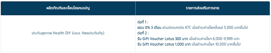 สิทธิพิเศษเมื่อลูกค้าทำรายการซื้อ ประกันสุขภาพ Health DIY (บมจ. ทิพยประกันภัย) ผ่าน Application Krungthai Next ตั้งแต่วันที่ 1 มีนาคม2566 – 31 มีนาคม 2566 ตามเงื่อนไขที่กำหนด โดยรับสิทธิพิเศษฉลองวันเกิดธนาคาร รับGift Voucher Lotus สูงสุด 1,000 บาท และสิทธิ์ผ่อน 0% ผ่านบัตรเครดิต KTC มีรายละเอียด ดังนี้