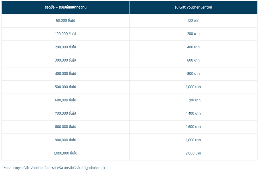 โปรโมชันซื้อ-สับเปลี่ยนเข้ากองทุนเด่น จาก 7 บลจ. ชั้นนำ ระหว่างวันที่ 13-31 มีนาคม 2566 สะสมรวม 50,000 บาทขึ้นไป รับ Gift Voucher Central มูลค่าสูงสุด 2,000 บาท