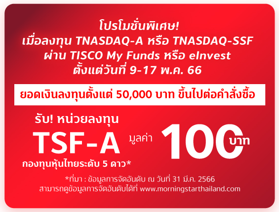 โปรโมชันพิเศษ! เมื่อลงทุน TNASDAQ-A และ TNASDAQ-SSF ผ่าน TISCO My Funds หรือ eInvest 50,000 บาทขึ้นไป รับหน่วยลงทุน TSF-A มูลค่า 100 บาท*