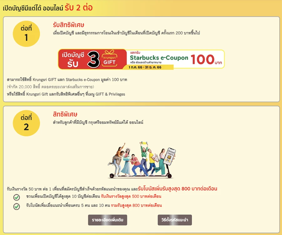 ธนาคารกรุงศรีอยุธยา จำกัด (มหาชน) ให้คุณรับทรัพย์ได้รัวๆ ต่อเนื่องทุกเดือน เมื่อเปิดบัญชีเงินฝากออมทรัพย์ "มีแต่ได้ ออนไลน์" ผ่านทาง KMA krungsri app ตั้งแต่การฝากเงินบาทแรก ถึง 1 ล้านบาท รับดอกเบี้ยทุกเดือน ด้วยอัตราดอกเบี้ย 1.5% ต่อปี และหากมีธุรกรรมการโอนเงินเข้าบัญชีออมทรัพย์ มีแต่ได้ ออนไลน์ ในเดือนที่เปิดบัญชีครั้งแรกขั้นต่ำ 200 บาทขึ้นไป ระหว่างวันที่ 1 กรกฎาคม 2566 - 31 ธันวาคม 2566 รับ Krungsri GIFT จำนวน 3 กิฟท์ แลกรับ Starbucks e-Coupon มูลค่า 100 บาท หรือส่วนลดร้านค้ามากมาย ที่เมนู GIFT & Privileges บน KMA krungsri app