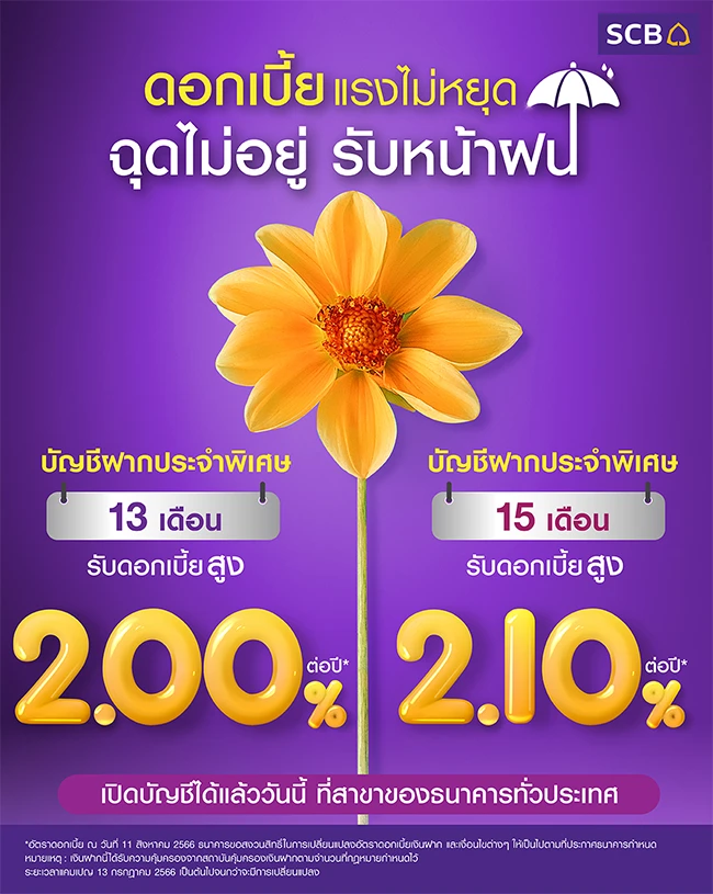 SCB ส่งโปรฯ ดี ดอกเบี้ยแรงไม่หยุด ฉุดไม่อยู่รับหน้าฝน เปิดบัญชีเงินฝากประจำพิศษ 13 เดือน และ 15 เดือน รับดอกเบี้ยสูงสุด 2.10% ต่อปี*