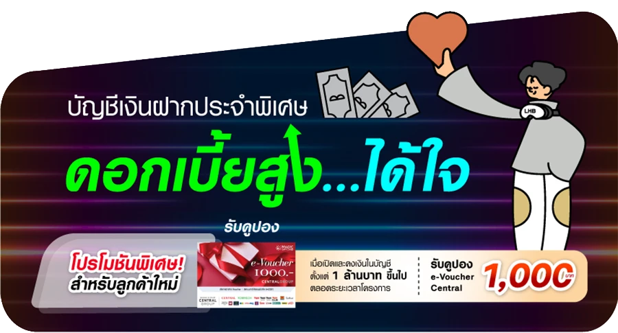 เปิดบัญชีขั้นต่ำ 100,000 บาท ถึง 100 ล้านบาท พิเศษ! สำหรับลูกค้าใหม่รับคูปอง E-Voucher Central มูลค่า 1,000 บาท เมื่อเปิดและคงเงินในบัญชีตั้งแต่ 1 ล้านบาทขึ้นไป ตลอดระยะเวลาโครงการ