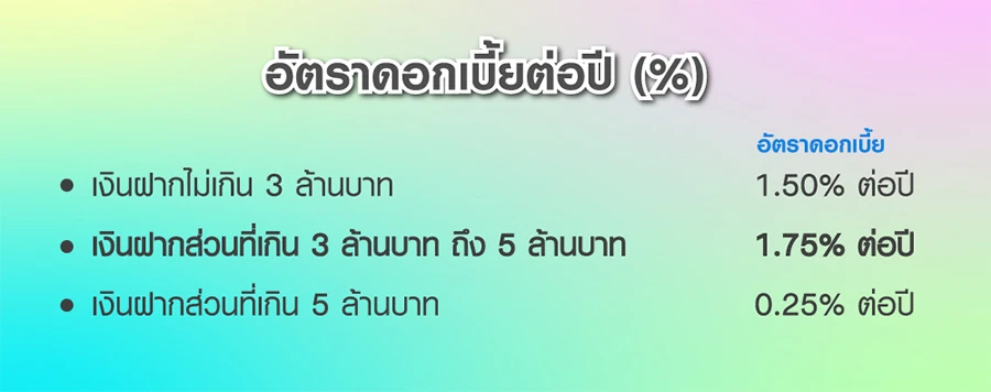 • รับดอกเบี้ยสูง 1.75% ต่อปี สำหรับเงินฝากส่วนที่เกิน 3 ล้านบาท ถึง 5 ล้านบาท