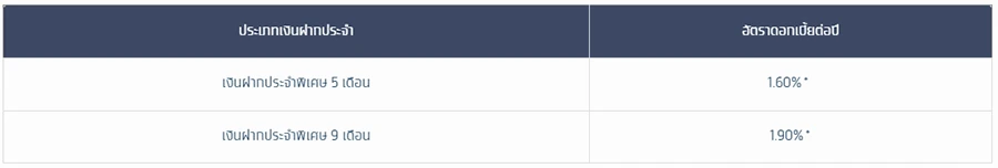• จ่ายดอกเบี้ยรายเดือนเข้าบัญชีคู่โอน (ออมทรัพย์/กระแสรายวัน) เมื่อครบกำหนดฝากจะเปลี่ยนประเภทเงินฝากประจำพิเศษ 5 เดือน และเงินฝากประจำพิเศษ 9 เดือน เป็นเงินฝากประจำ 3 เดือน โดยอัตราดอกเบี้ยและเงื่อนไขการฝากประจำ 3 เดือนเป็นไปตามประกาศ ณ ขณะนั้น โดยยังคงใช้สมุดบัญชีเดิม และเลขที่บัญชีเดิม