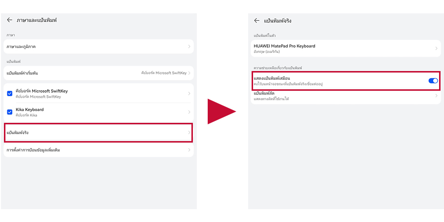เรียกว่าปัญหาก็ไม่เชิง เมื่อมีหลายคนที่ต้องการยืดหยุนการทำงานให้ตัวเองด้วยการที่เชื่อมต่อ HUAWEI Smart Keyboard ไว้เป็นแป้นพิมพ์แยก แต่ยังต้องการให้แป้นพิมพ์เสมือนแสดงขึ้นบนหน้าจอแท็บเล็ตเพื่อใช้งานในฟีเจอร์ลัดอื่น ๆ ด้วยเช่นกัน ซึ่งก็สามารถตั้งค่าได้ง่าย ๆ ดังนี้