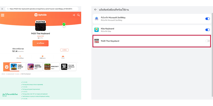 เลือกติดตั้งแอปพลิเคชัน '9420 Thai Keyboard' หรือ 'Hardware Thai Keyboard’ กดติดตั้งพร้อมอนุญาตการเข้าถึงทั้งหมดให้เรียบร้อย