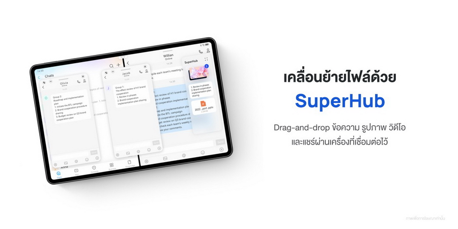 ด้วยระบบปฏิบัติการ HarmonyOS คุณสามารถถ่ายโอนรูปภาพ วิดีโอ และแม้แต่ข้อความจำนวนมากด้วยการลากและวางที่ง่ายดายเพียงครั้งเดียว เพียงคุณกดที่ข้อความ รูปภาพ วิดีโอ และไฟล์ใดๆ ค้างไว้ แล้วลากไปที่หน้าต่างลอยของ SuperHub เพื่อเก็บไฟล์ไว้ชั่วคราว จากนั้นผู้ใช้สามารถสลับไปยังแอปพลิเคชันอื่น เลือกไฟล์ภายใน SuperHub เพื่อการ Copy และ Paste ได้อย่างสะดวก ด้วยความสามารถในการถ่ายโอนแบบกลุ่ม ผู้ใช้ยังสามารถใช้ SuperHub สำหรับการถ่ายโอนหลายไฟล์ระหว่างสมาร์ทโฟน แท็บเล็ต และพีซีได้อย่างไร้รอยต่ออีกด้วย